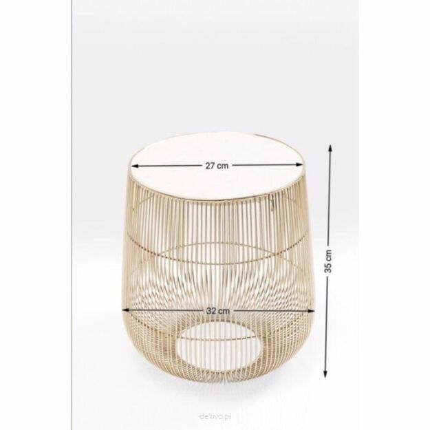 KARE stolik BEAM 32 biały. Idealny wybór dla miłośników subtelnego i nowoczesnego designu. Złota podstawa wykonana z filigranowych prętów harmonijnie łączy się z okrągłym marmurowym blatem w białym kolorze, tworząc stylowy i praktyczny dodatek do każdego wnętrza. Połączenie naturalnego marmuru i mosiądzowanej stali nadaje stolikowi elegancki, wyrafinowany wygląd. Ręczne wykonanie podkreśla wysoką jakość i unikalność każdego egzemplarza. Stolik zapewnia dodatkowe miejsce na przechowywanie przedmiotów, jednocześnie dodając wnętrzu letniej lekkości i harmonii. Dzięki swojej uniwersalnej estetyce pasuje zarówno do nowoczesnych, jak i klasycznych aranżacji wnętrz, będąc doskonałym miejscem na dekoracje lub ulubiony napój. Wymiary: wys. 35 cm / szer. 32 cm / gł. 32 cm Waga netto: 4,61 kg.