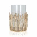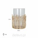 RICHMOND świecznik LORETTA L. Uroczy świecznik ozdobiony delikatnymi złotymi gałązkami. Całość wykonano w wyniku połączenia aluminium ze szkłem. Dekoracja Loretta wniesie do każdego pomieszczenia przytulny klimat a przy tym nutę elegancji. Dostępna także mniejsza wersja. Wymiary: wys. 31,5 cm / szer. 22 cm / gł. 22 cm Waga netto: 2,6 kg.